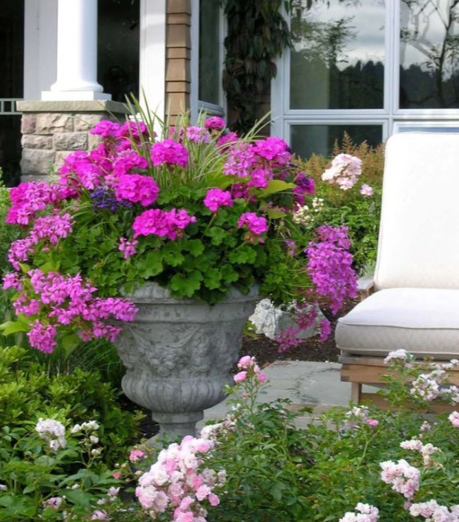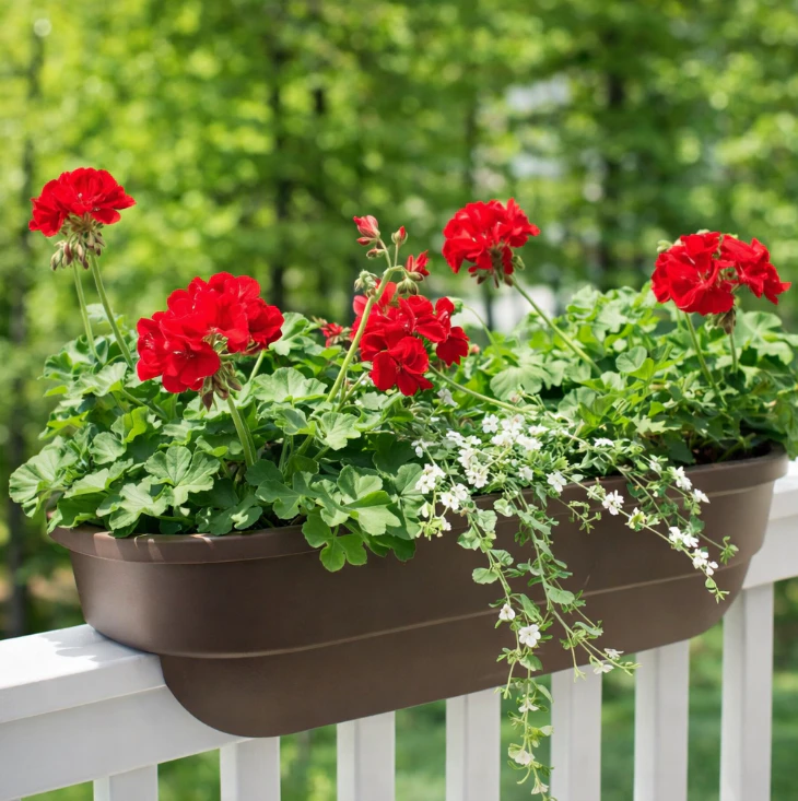 Geraniums play very well with others, making them perfect for mixed flower planters. You can easily combine them with trailing petunias, sweet alyssum, or even functional herbs to create a rich, layered arrangement.