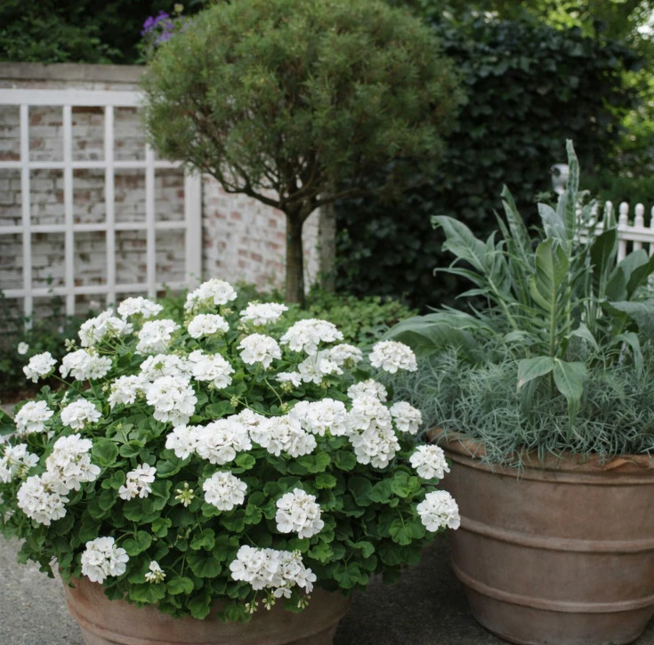 Instead of mixing five different shades, plant only bright white geraniums in crisp white pots. It looks super clean, elegant, and instantly brings a sense of calm to a busy luxury patio.