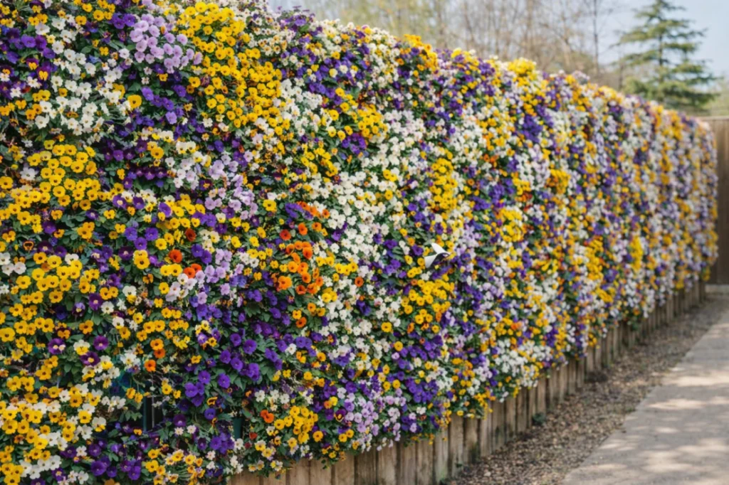 You can mount metal rings to hold individual pots or buy pocketed wall bags. Fill them with trailing ivy geraniums, and they will cascade beautifully down the wall like a floral waterfall.