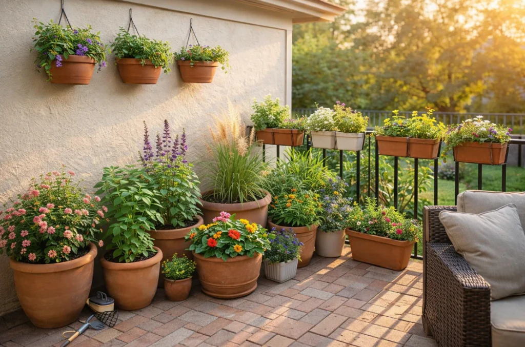 Hanging pots create a magical, floating garden effect that immediately draws the eye upward. They are an essential element for creating a cozy, wrap-around garden feel on your patio.