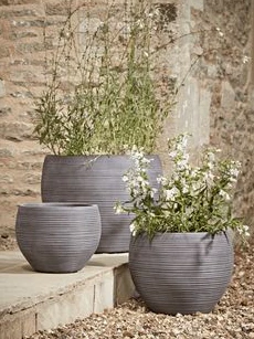 These sleek planters are usually made from lightweight fiberglass or polished concrete. They offer a highly sophisticated and expensive look to your outdoor seating area.