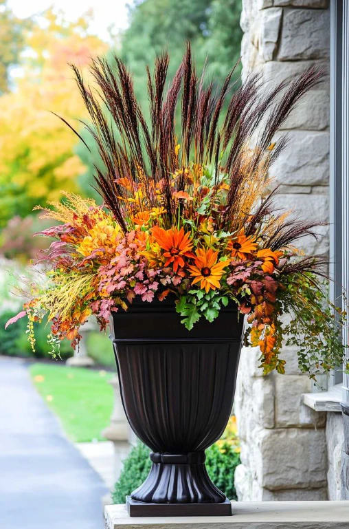 - Taller plants at the back: Place tall architectural plants (like ornamental grasses or canna lilies) in the largest back pot.
